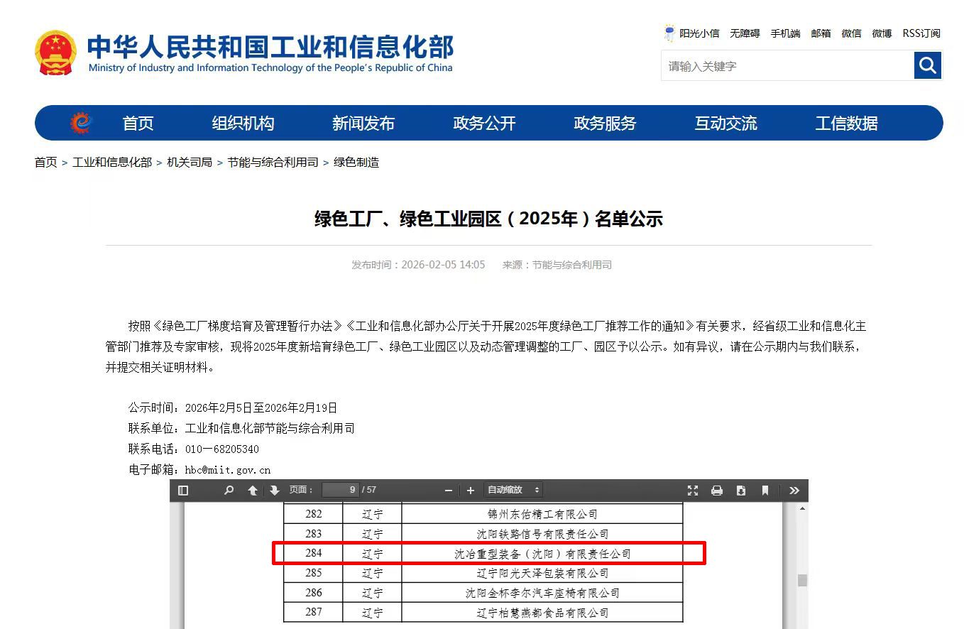 近日,工业和信息化部公示2025年度国家级绿色工厂名单,沈冶重型装备(沈阳)有限责任公司凭借在绿色制造领域的卓越实践与突出成效成功入选,正式跻身国家级绿色制造标杆行列。这是继2025年获评辽宁省级绿色工厂后,公司在绿色发展道路上取得的又一里程碑式突破,标志着其生产经营与管理体系全面达到国家绿色制造最高标准 。